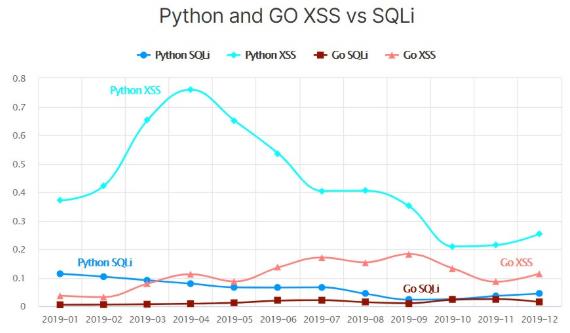 接下來(lái),該公司又對(duì)兩種最常見(jiàn)的攻擊——XSS 和 SQLi——以及通過(guò) Go 和 Python 使用這些攻擊的嘗試進(jìn)行了觀察。值得注意的是,到 2019 年底,Go 在兩種類型的攻擊中都趕上了 Python。不過(guò),判斷這種趨勢(shì)是否會(huì)持續(xù)還為時(shí)過(guò)早,但 Go 變得越來(lái)越流行是毋庸置疑的。