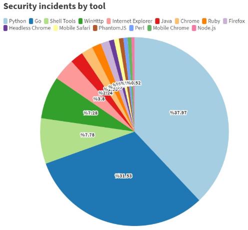 按工具來(lái)分類,Python 依舊是大多數(shù)黑客的首選武器,緊接著是使用量增長(zhǎng)迅速的 Go 語(yǔ)言;再其次是 WinHttp 庫(kù),該庫(kù)主要由 Windows 上運(yùn)行的 .net 和 CPP 使用;Shell 工具(如 cURL、wget 等)也榜上有名。瀏覽器也是常用的攻擊工具。