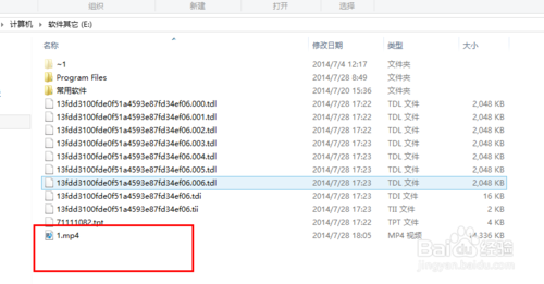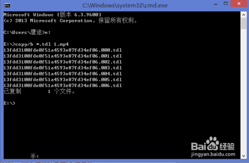 7、然后輸入:copy/b*.tdl1.mp4對E盤下所有tdl格式的文件進行合并。然后你就會看到E盤下有個1.mp4的視頻了。