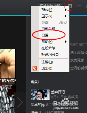 3、在客戶端界面右上角,點擊向下箭頭按鈕,彈出如下圖中所示的菜單,然后點擊設(shè)置選項。